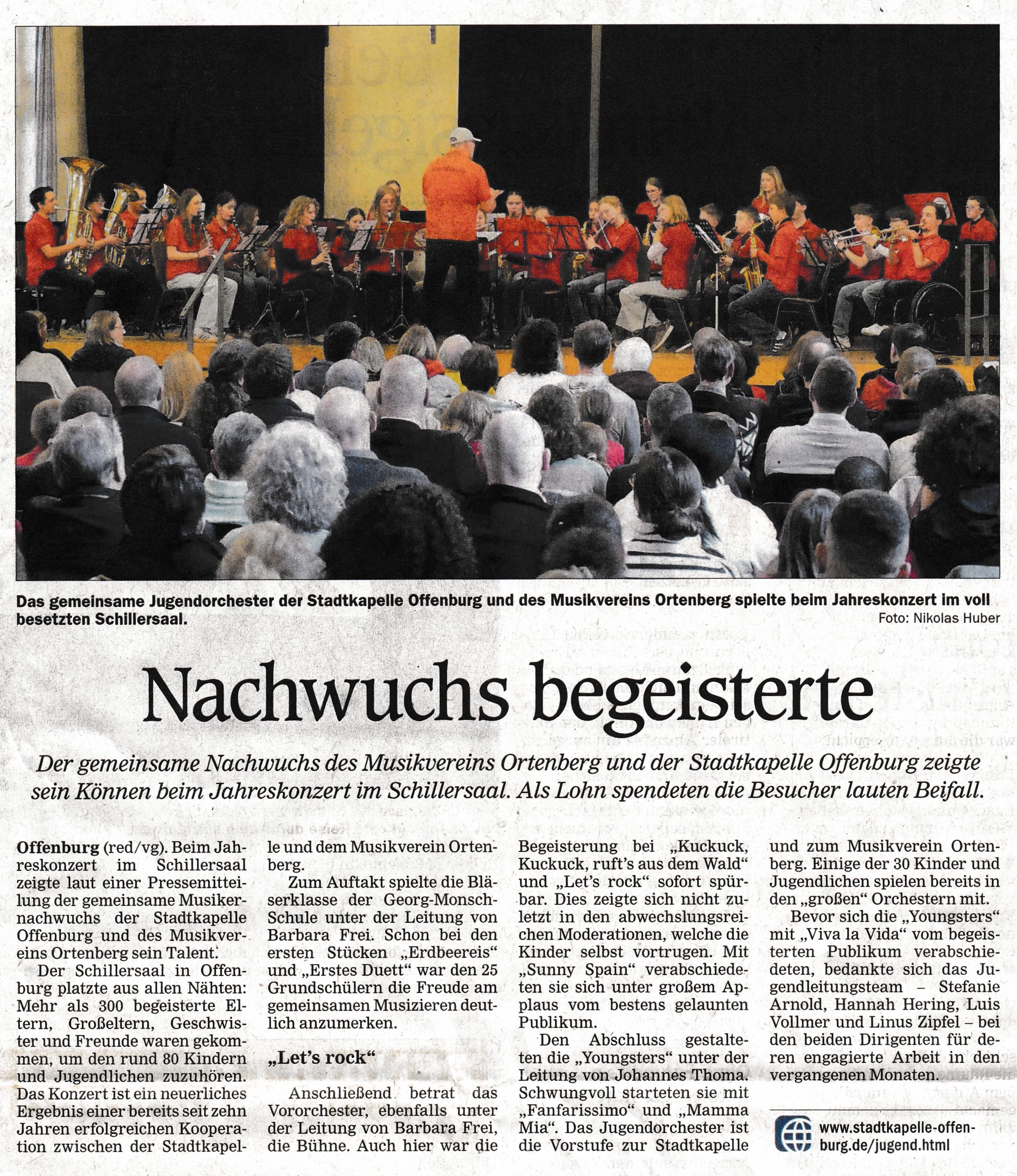 Der Schillersaal platzte aus allen Nähten: Über 300 begeisterte Eltern, Großeltern und Geschwister waren gekommen, um den mehr als 80 Kindern und Jugendlichen zuzuhören. Das Konzert ist das Ergebnis einer bereits seit zehn Jahren erfolgreichen Kooperation zwischen der Stadtkapelle und dem Musikverein Ortenberg.