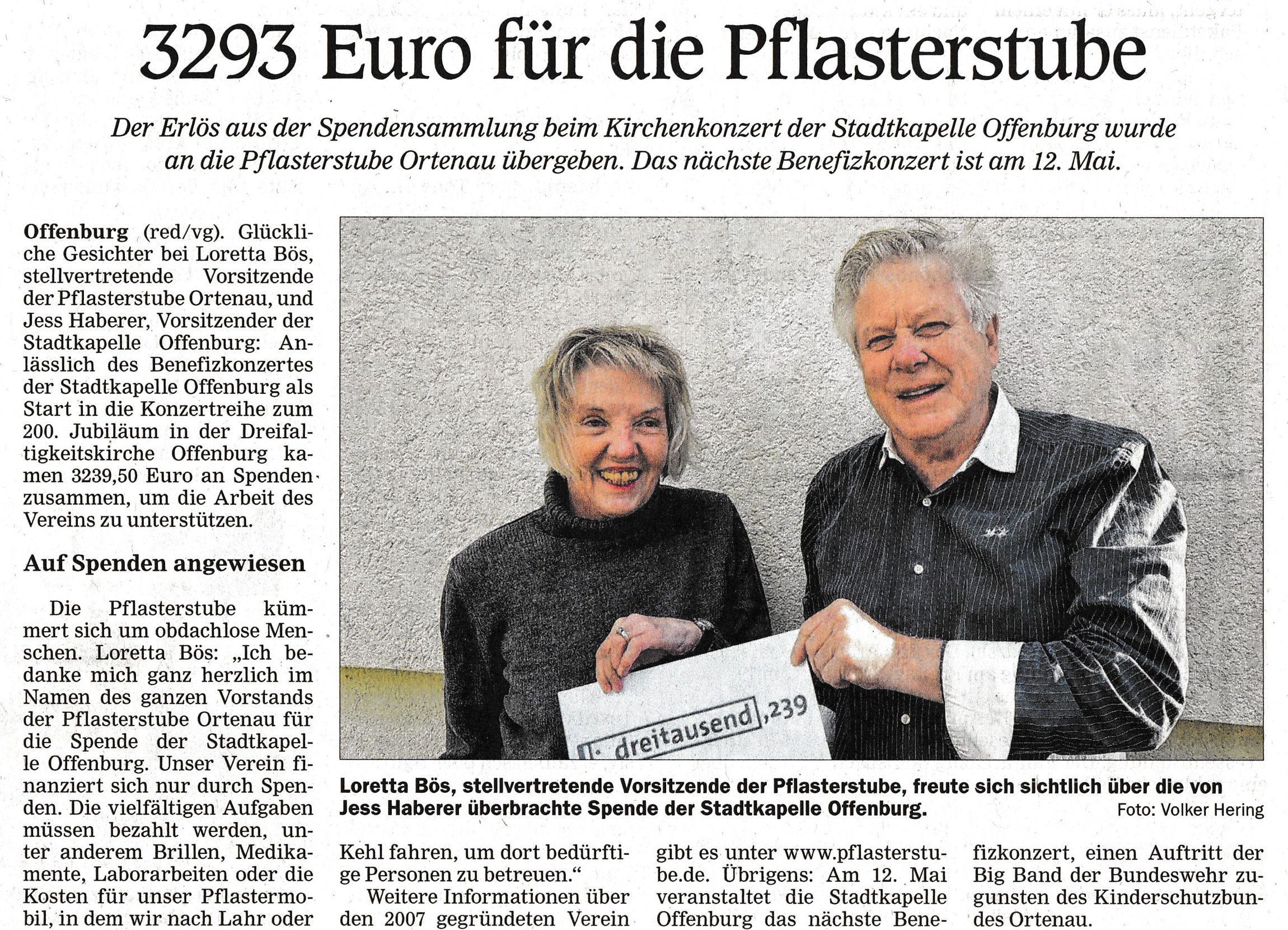 Das Kirchenkonzert war nicht nur für die Stadtkapelle ein gelungener Auftakt in das Jubiläumsjahr, sondern auch für die Pflasterstube Ortenau. Im Anschluss konnte Jess Haberer eine Spende in Höhe von 3.239,50 € an den Verein überreichen, der sich um obdachlose Menschen kümmert.